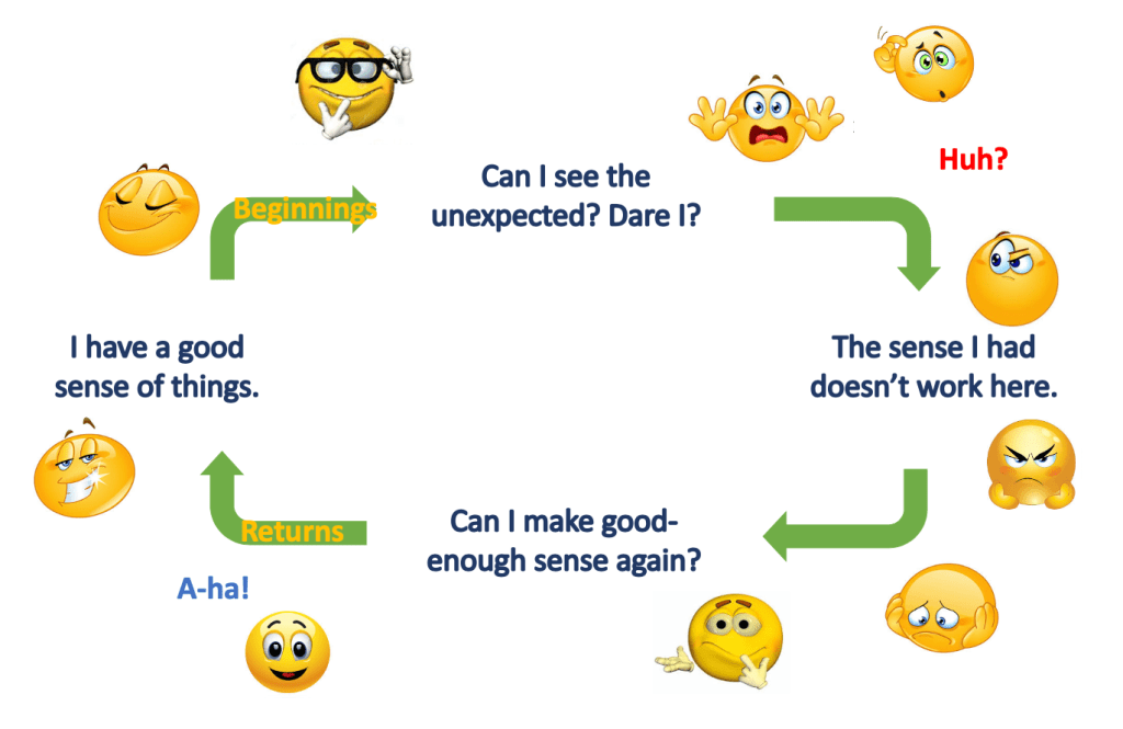 In this way, the Circle of Learning is dialectic. We begin with a sense of what we know; including our present thesis of whatever that knowing entails. Then we run into something that makes us say “Wait. What?” The something that triggers us to think “Huh?” is an antithesis that challenges our current thesis about how things are or should be. When we make it around the circle we get back to ourselves by formulating a broader understanding. That broader understanding is the synthesis of what we knew before (the thesis) and what we were confronted with (the antithesis). The synthesis becomes our new working thesis for another turn around the circle.